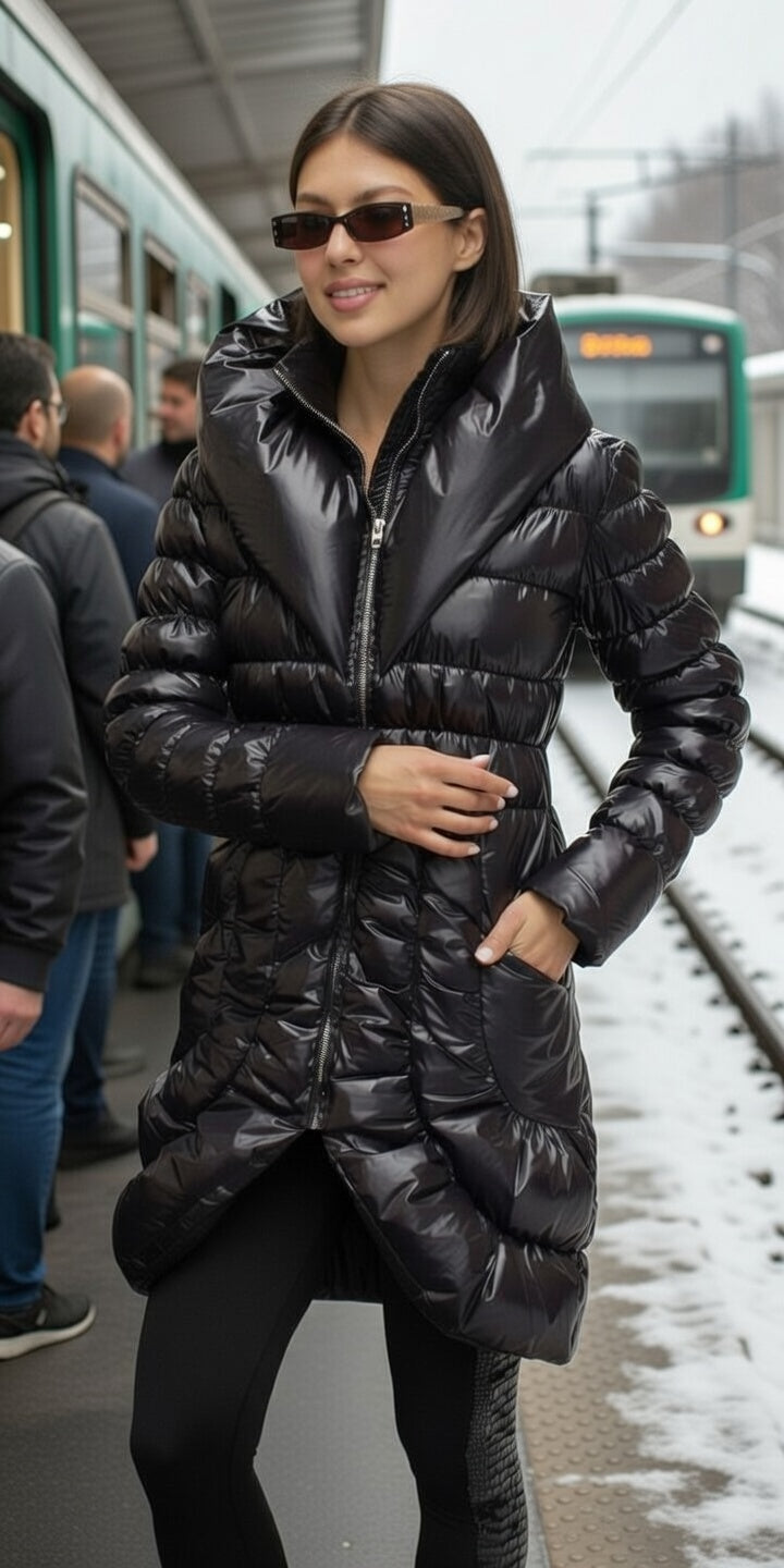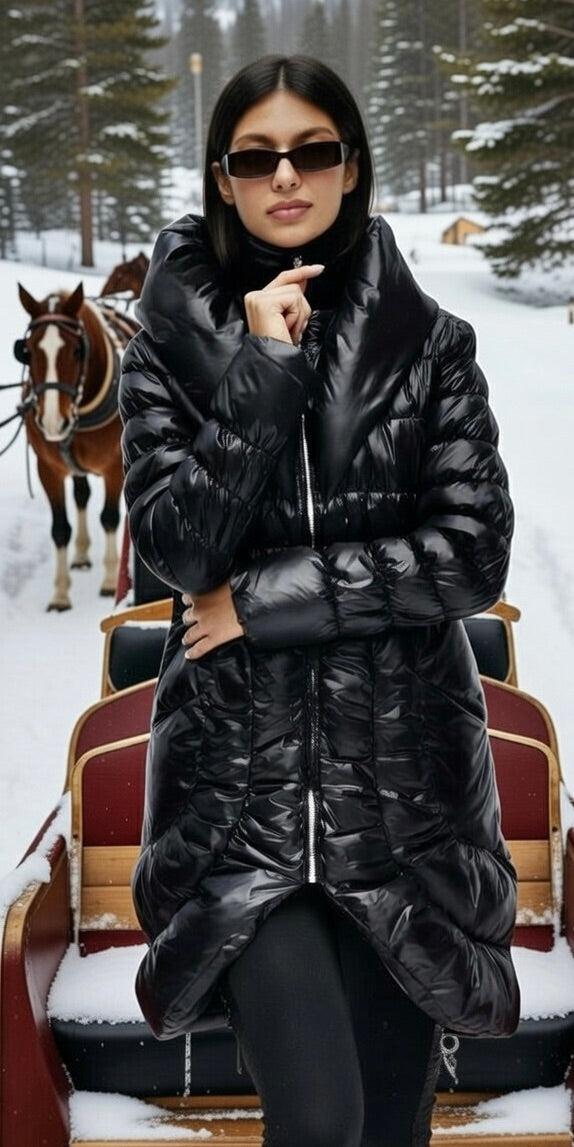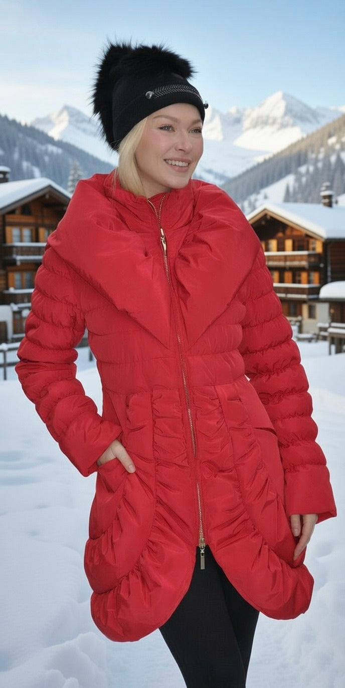 It would be hard - dare we say impossible to find a puffer coat as stylish and sophisticated as this. The dramatic shawl collar stands up close to the neck in lieu of a scarf. And its shape is enhanced by a curved front hem, streamlined ruffled back, Features front zip and Falls right by Knee.