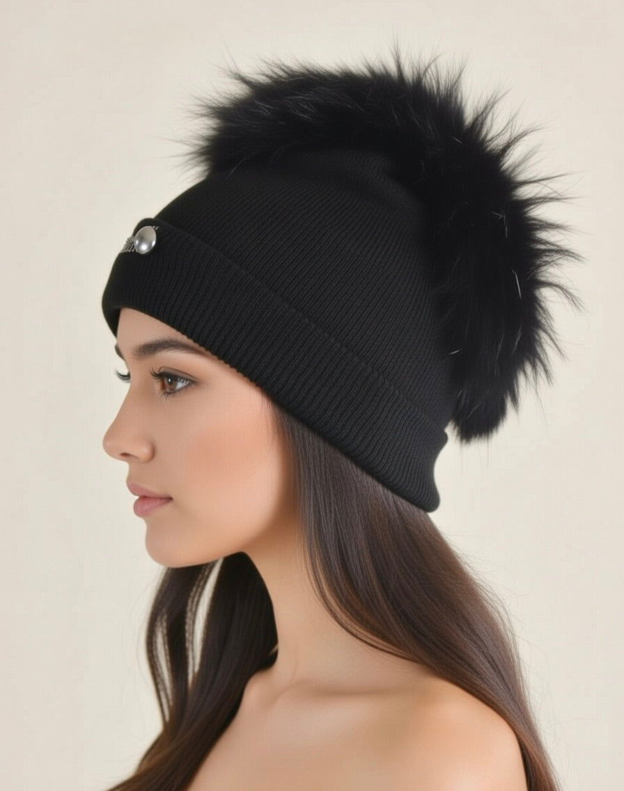 Warm knitted hat with Fur Trim and Ciao Milano Hardware. Caesar Rome Inspiration. Black only.