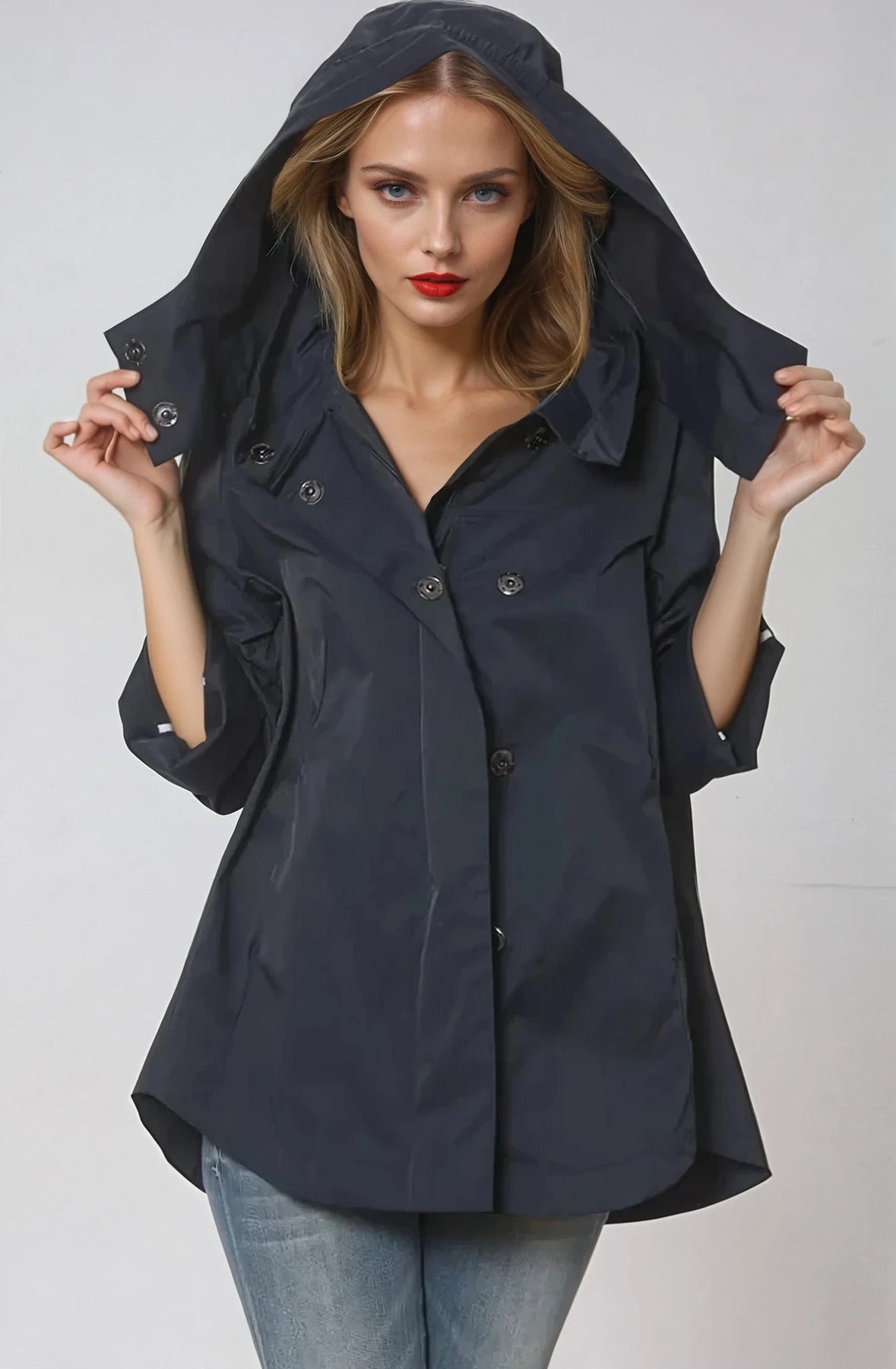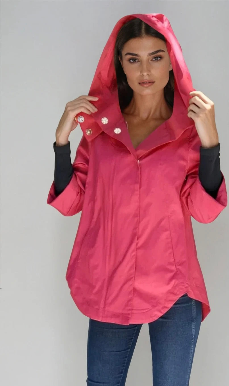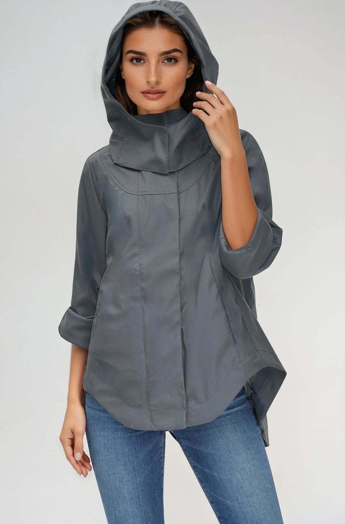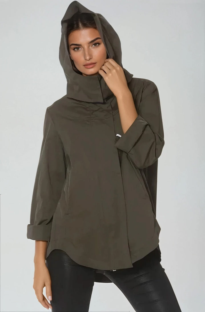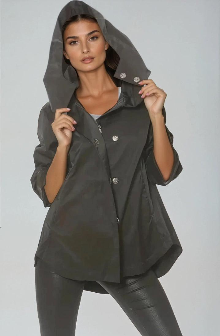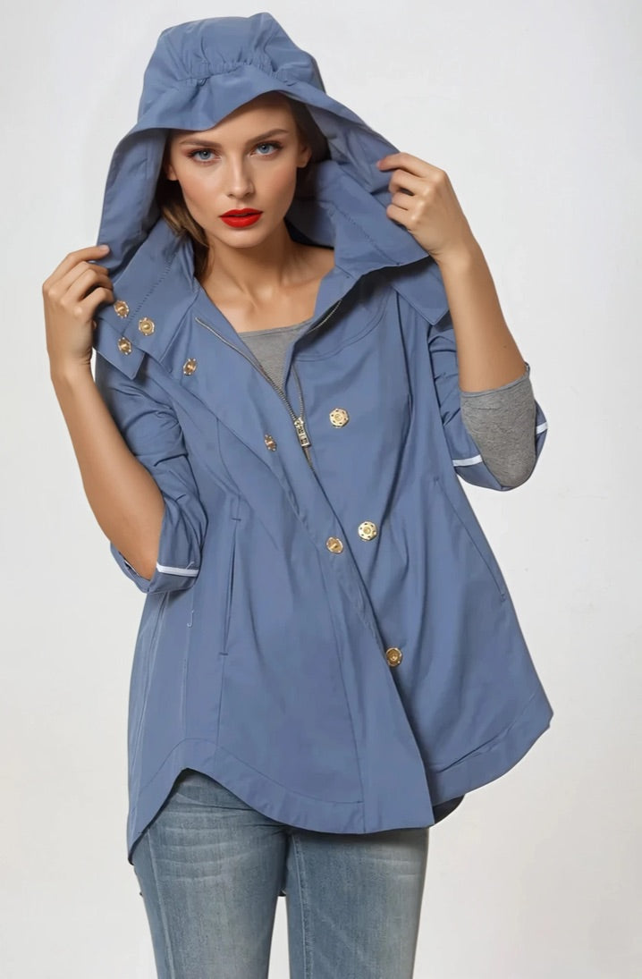style SAVINA Same fabric and hardware as TESS but with a very sophisticated zip off hood. It has the same adjustable sleeves that can be left at full length or cuffed and snapped to a fashionable ¾ sleeve. Hidden side pockets on each side of the jacket are also well placed. SAVINA is unlined with taped seams and the length is shorter in the front than the back.